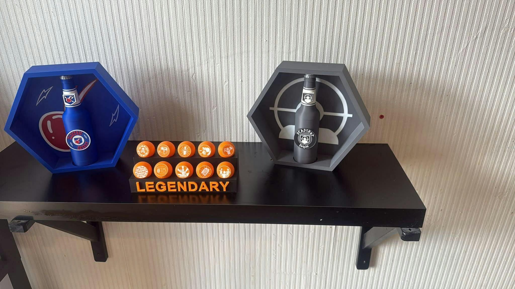 🖤 Black display stand with bold orange “LEGENDARY” lettering